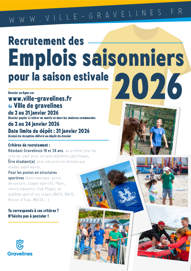Pour pouvoir déposer sa candidature, il faut être âgé de +18 ans et de -25 ans au 1er jour du contrat, être domicilié à Gravelines et être scolarisé. En fonction du nombre de postes ouverts pour la saison et du nombre de candidatures, des critères de recrutement seront définis.