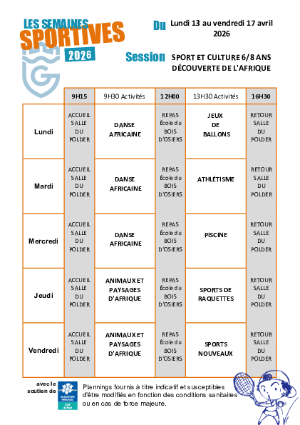 ▪️Semaine du 13 au 17 avril : Sport et Culture (4/5 ans*, 6/8 ans* et 9/12 ans), Sport et Nature (6/8 ans et 9/12 ans)