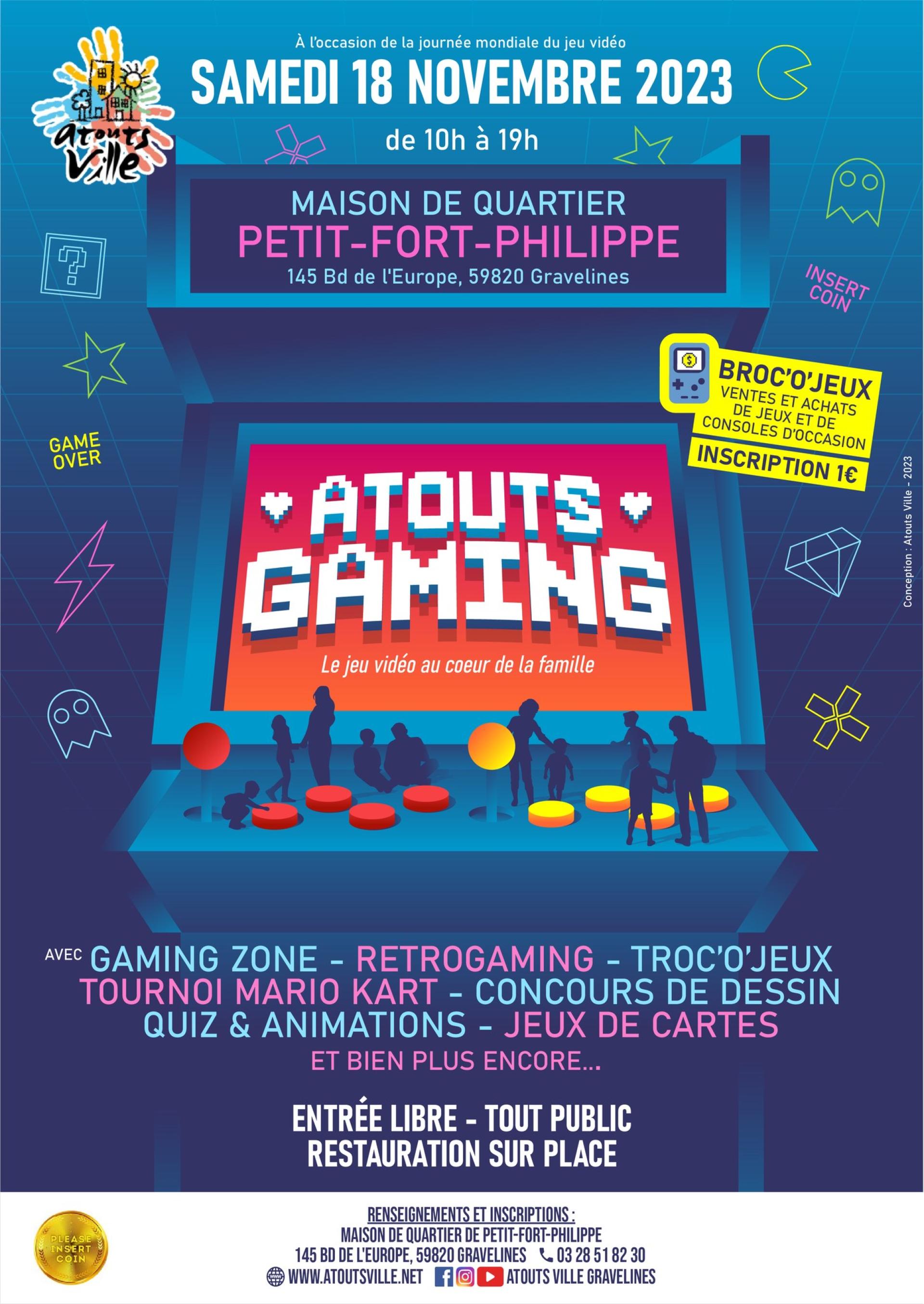 Rendez-vous samedi 18 novembre, de 10h à 19h en Maison de quartier de Petit-Fort-Philippe pour une journée spéciale autour de l'univers du jeu vidéo en famille !